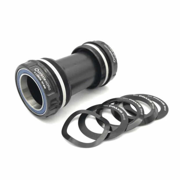 Le boîtier de pédalier fileté Praxis T47 est compatible avec les cadres route de 68 mm et VTT de 73 mm. Il est doté de roulements à cartouche acier. Il est conçu pour les axes de 30 mm côté transmission et 28 mm de l’autre côté.