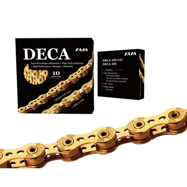 La chaine Taya Deca 101UL est le parfait exemple de comment une chaine peut délivrer en même temps un poids des plus léger et une solidité et résistance à toute épreuve. Son designe UL (Ultima lite) avec plaques et rivets creux lui assure une légèrete hors du commun pendant que le traitement DHT (Diamond hard Technology) procure solidité, résistance et un passage de vitesse onctueux et précis. Le traitement Ti-gold réduit les frictions pour encore gagner en rendement et protège la chaine des intempéries.
