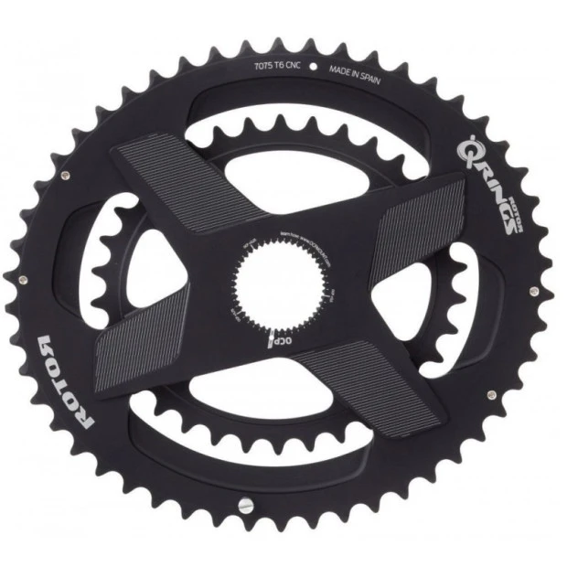 Double plateaux Rotor Q-Ring Direct Mount pour pédaliers route Aldhu, Vegast, INpower DM Road et 2INpower DM Road. L’ovalisation de 12,5% accroît les performances par rapport à un un simple plateau ovale. De plus le système de réglage des positions OCP permet au plateau ovale Direct mount d’être ajusté par crans d’un degré pour optimiser le pédalage.